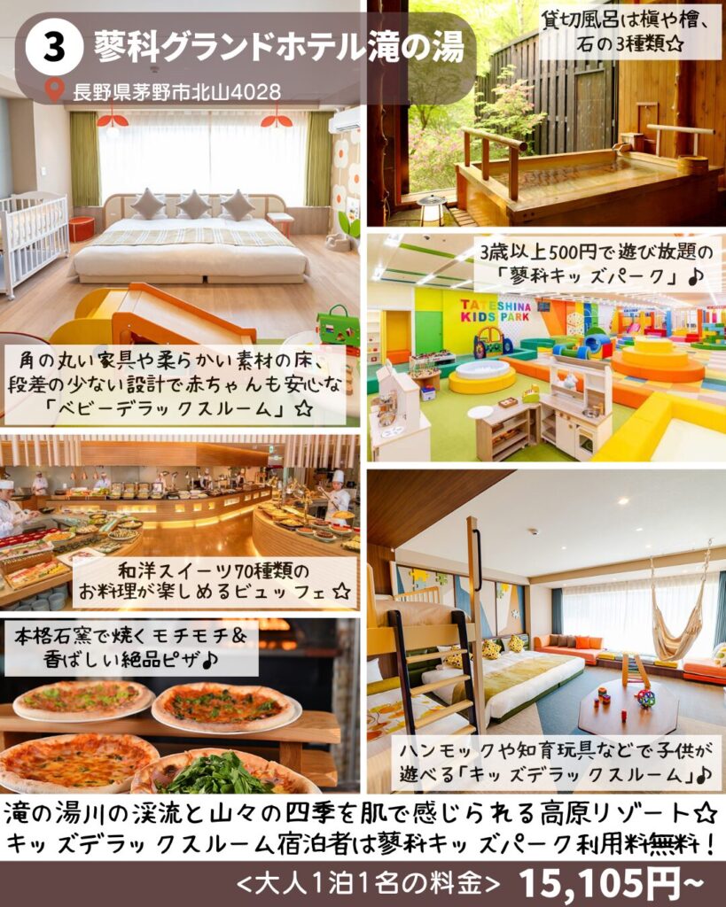 さらに、お部屋に「木の2段ベッド」や「ハンモック」があり、専用キッズパークも無料(3. 蓼科グランドホテル滝の湯)になるホテルや、赤ちゃん連れに優しい「ウェルカムベビー認定」のお部屋(7. ベルナティオ)まで、コンセプトが盛りだくさんです。