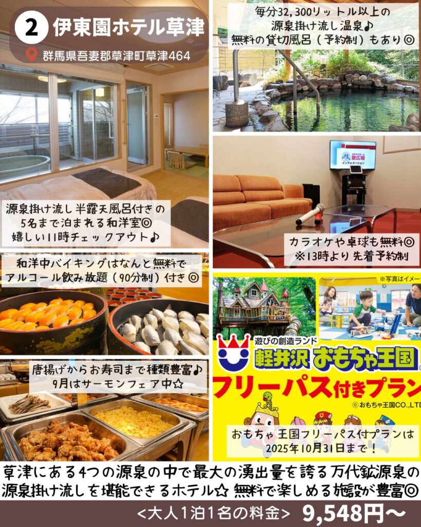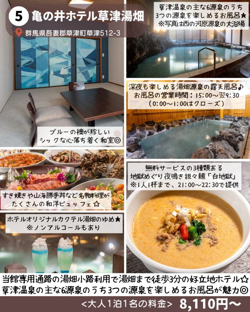 - 「草津温泉ホテルリゾート」「亀の井ホテル草津湯畑」湯巡り可能