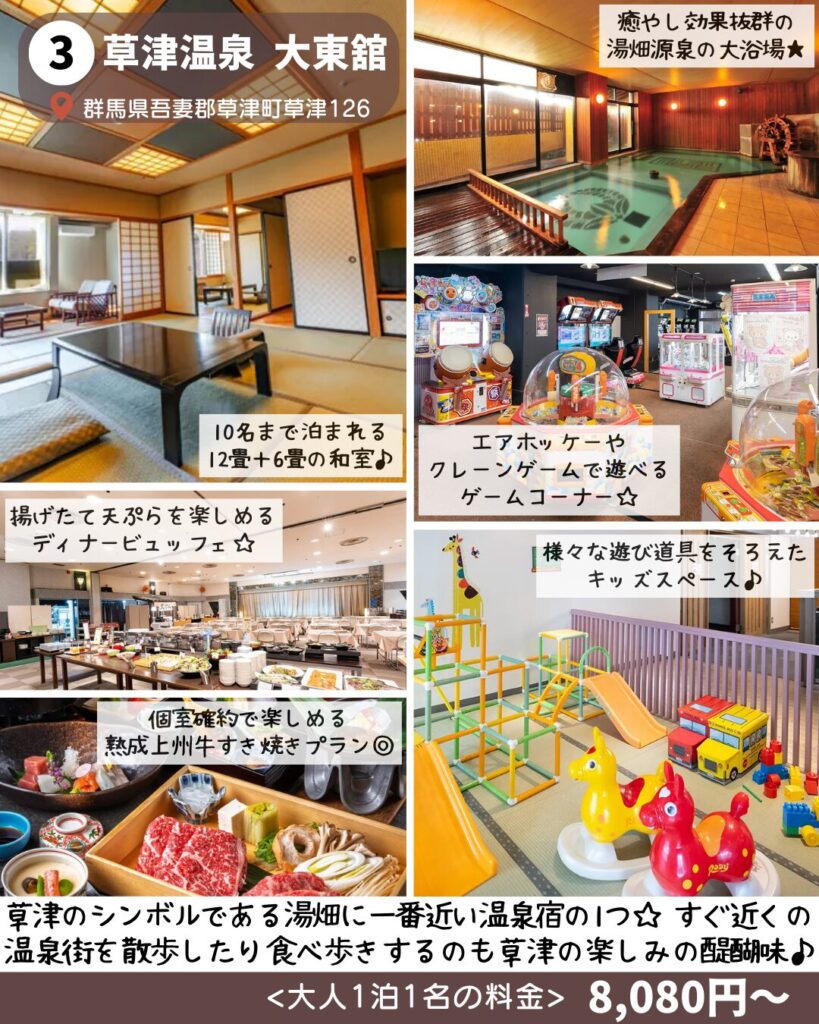- 姉妹館「大東館」「草津温泉ホテルリゾート」とゆめぐり可能