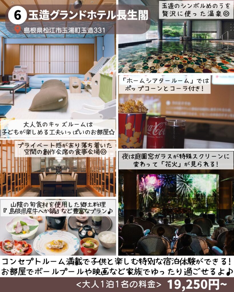 さらに、赤ちゃんも安心の「畳敷きのお風呂」(湯楽)や、しまねっこルームがある「玉造国際ホテル」など、子どもが主役になれるホテルばかり。